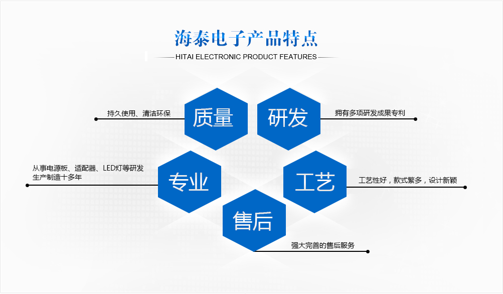 威海海泰電子有限公司成立于2003年(原威海雙豐通訊設備有限公司),是一家致力于開關電源、LED電源、電源適配器、手機充電器、醫療電源等自主研發、生產和銷售為一體的高新技術企業。公司秉承 “以顧客為中心”的宗旨,堅持“以人為本、質量至上 、節能降耗、清潔環保、持續改進 ”的質量和環境方針,科學高效的組織生產,不斷的提高產品質量。先后通過了ISO9001質量管理體系認證、GJB9001C質量管理體系和GJB3001C質量管理體系和ISO14001環境管理體系認證。